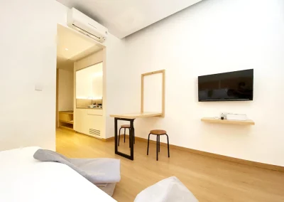 Each Deluxe Studio features a king‑size bed, air conditioning, and an inviting layout that maximizes space efficiency. Guests enjoy thoughtful amenities such as a kitchenette, which includes a mini‑fridge, stovetop, essential cookware, and dining utensils—making it convenient for light meal preparation. The room also includes a private bathroom with a rainfall showerhead, bidet, hairdryer, and free bottled water. These small details ensure comfort whether you’re staying for one night or an extended period.
